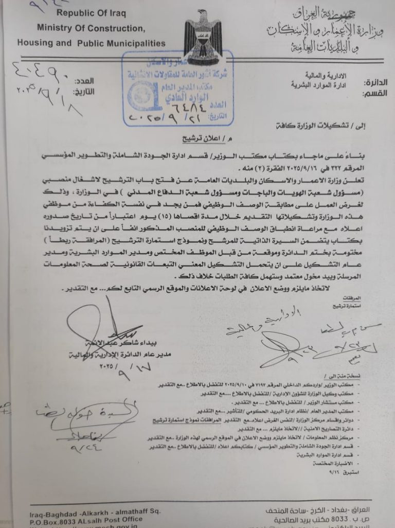 ترشيح لاشغال منصب مسؤول شعبة الهويات و الباجات و مسؤول شعبة الدفاع المدني في الوزارة