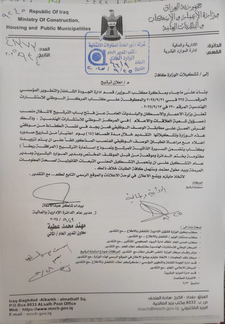 ترشيح لاشغال منصب مسؤول شعبة العلاقات والاعلام في المركز الوطني للاستشارات الهندسية